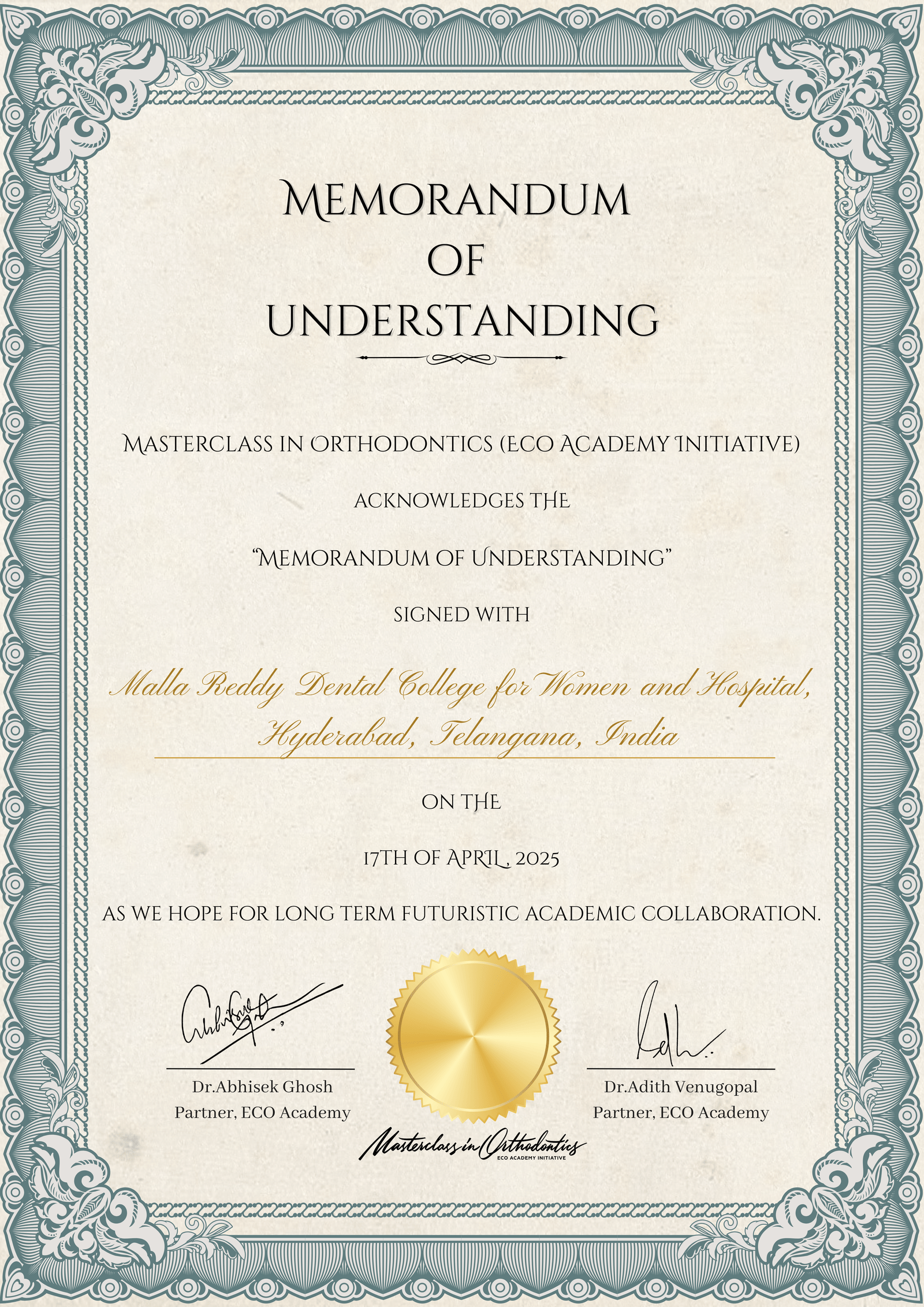 He completed his MDS from Ragas Dental College, Chennai under the guidance of Dr. N. R. Krishnaswamy. He is a “Diplomate of the Indian Board of Orthodontics” and is currently serving as the Director of Indian Board of Orthodontics. He has been awarded M.Orth RCS from Glasgow and M.Orth RCS from England.